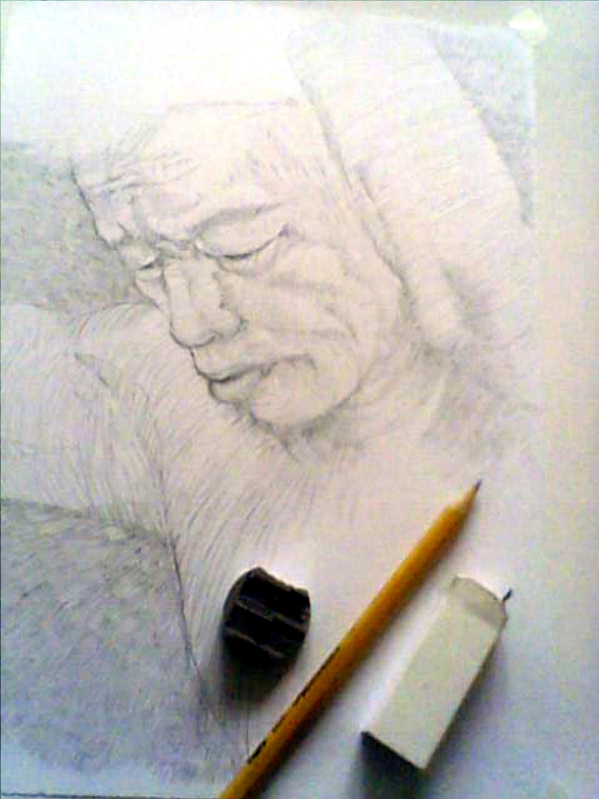 I was playing around with a photo, wondering how it would look if I copied the image on paper. Got me a pencil, a standard letter-sized bond paper and just lightly lined and sketched.
